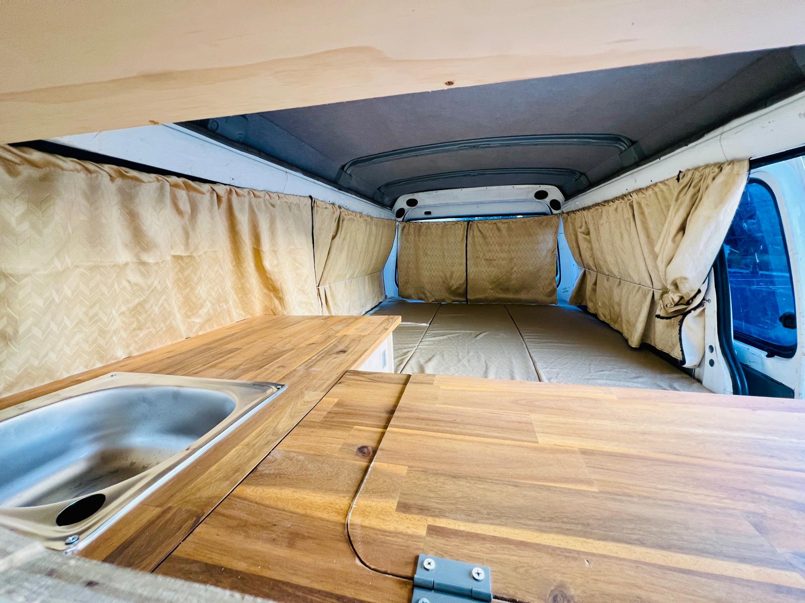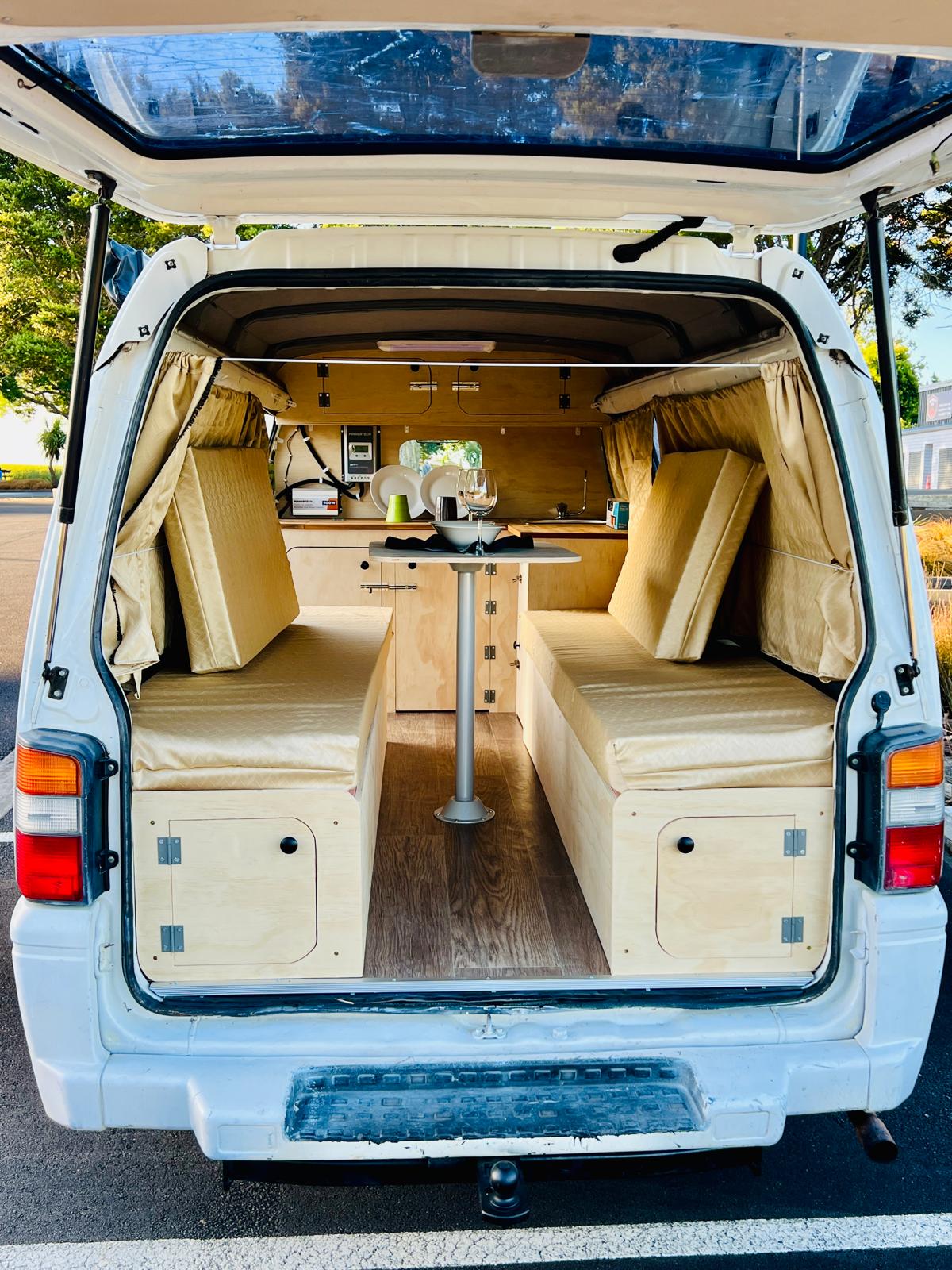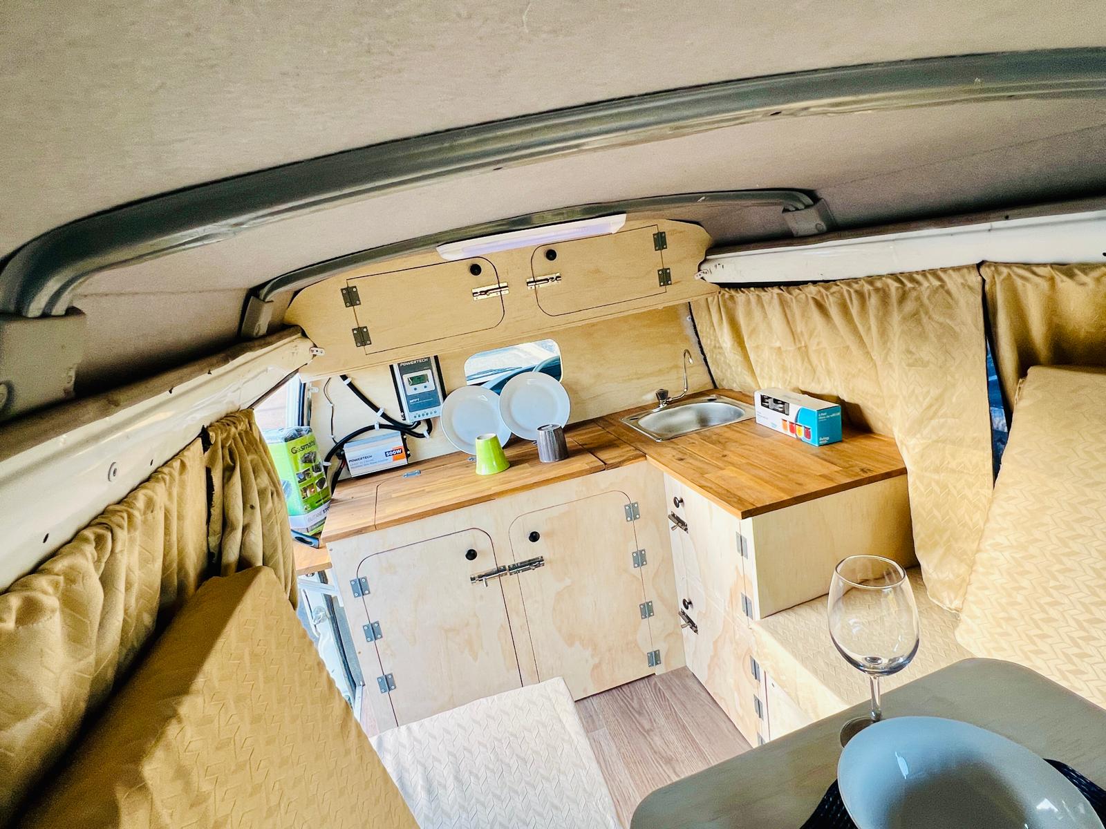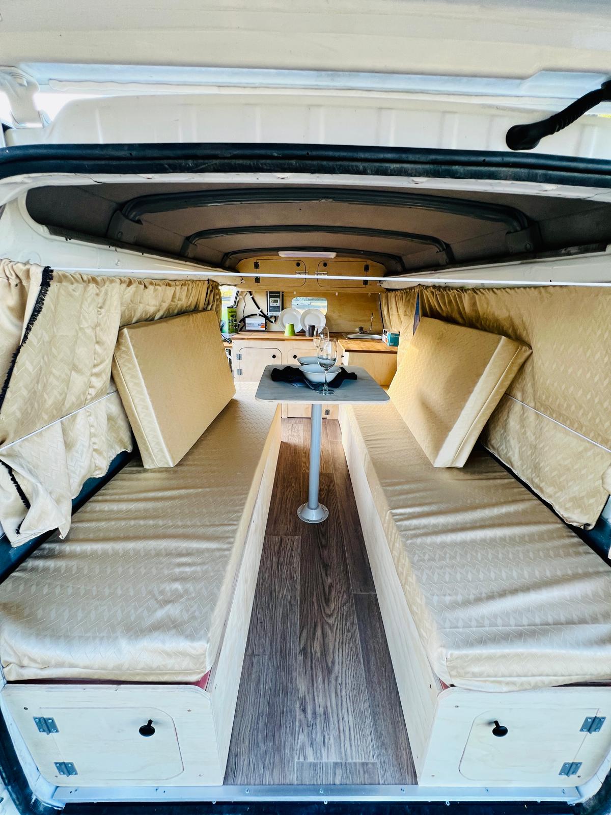 It is very tidy van, folding double bed that converts into a table. There is a lot of space under the bed for storage and also there is a kitchen where you can cook and etc.